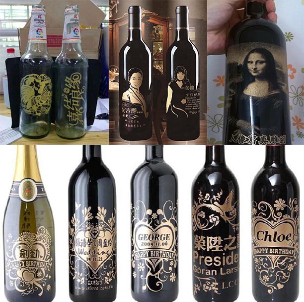 使用激光雕刻的圖文字畫不易消失,不用擔(dān)心被篡改;激光本身是無接觸加工,不會對酒瓶本身造成破壞;不管圖文字畫還是影雕,都形象逼真,精細(xì)光滑,不管酒瓶是何種不規(guī)則形狀,激光雕刻機(jī)都可以解決。