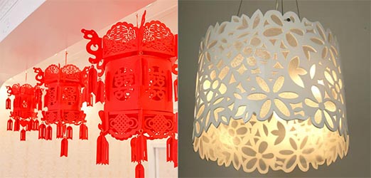 燈飾材料:基本上是PVC,有表面帶布的,也有帶紙的。制作工藝有打孔,雕花,切割花形等等,有的需要離焦畫線,也有切割花形的,具體要看圖形大小 。