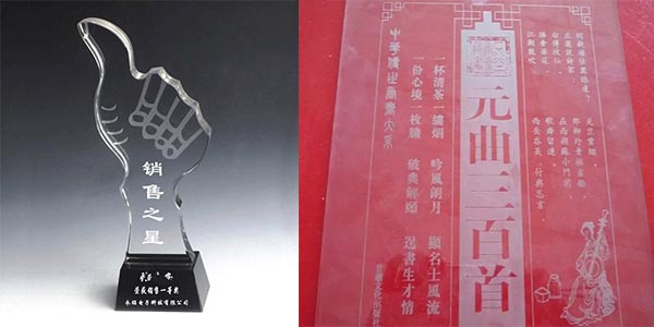雕刻:一般情況下亞克力采用背雕方式,也就是說從前面雕刻,后面觀看,這使得成品更具立體感。在背雕時先將圖形加以鏡像,且雕刻速度要快,功率要低。如雕刻時功率過高,會使底面出現不平整的條紋,如希望雕得深一些可試著多雕幾次。在背雕情況下對局部著色應先將著色處雕得較深些,然后使用火焰拋光機拋光,才可加以填色。如不經拋光處理,從前面看到的顏色就不會均勻。