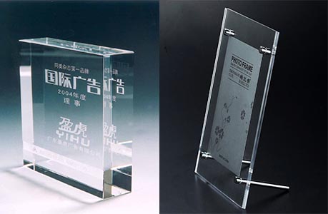 一般情況下有機(jī)玻璃采用背雕方式,也就是說從前面雕刻,后面觀看,這使得成品更具立體感。在背雕時(shí)請先將圖形加以鏡像,且雕刻速度要快,功率要低。如雕刻時(shí)功率過高,會使底面出現(xiàn)不平整的條紋,如希望雕得深一些可試著多雕幾次。在背雕情況下對局部著色應(yīng)先將著色處雕得較深些,然后使用火焰拋光機(jī)拋光,才可加以填色。如不經(jīng)拋光處理,從前面看到的顏色就不會均勻。