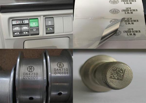 激光打標應(yīng)用于汽車行業(yè)其主要的功能為產(chǎn)品的管理及追溯,標刻的內(nèi)容大致為零件號、批號、流水號、二維碼等內(nèi)容,神繪激光的激光打標機已在國內(nèi)大多數(shù)汽車零部件企業(yè)推廣應(yīng)用。
